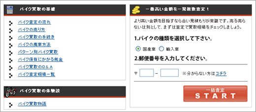 まずは本サイト、「元バイク業者トラ吉が教える!高額査定のコツ」のTOPページに戻ってみてください。「はじめまして〜」の挨拶文の右下に、「一番高い金額を一発複数査定」と書かれたタイトルが見つかるはず(↓)。
