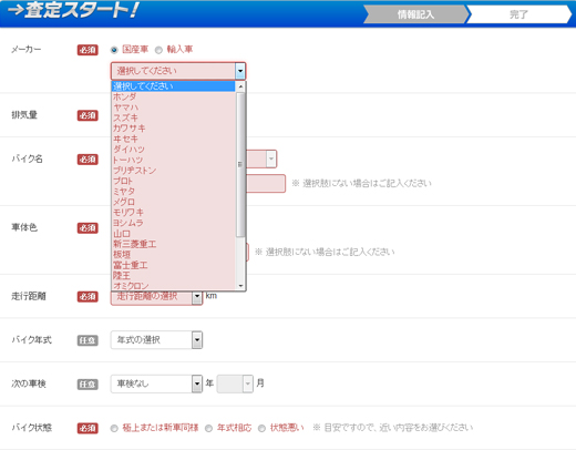 例えば、冒頭のバイクメーカーを選ぶ場合、「選択してください」と書かれたバーのすぐ横にある↓ボタンをプルダウンすれば、さまざまなメーカーが表示されるので、該当するものを選択します。