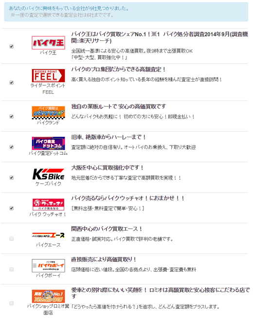 査定額を知りたい業者の、□ボックスにチェックを入れてください。