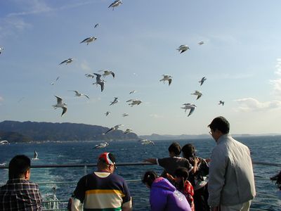 天気がよかったので船室の外に出て見ると、カモメたちが乗客の投げるポップコーンを目当てに集まって来ています。